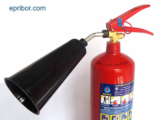 Огнетушители работают по принципу вытеснения заряда двуокиси углерода под действием собственного изб
