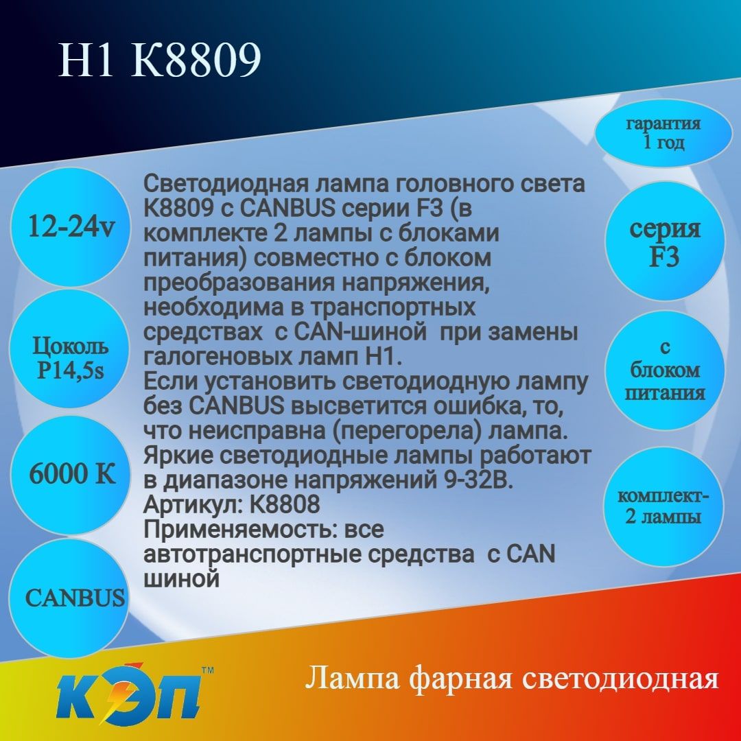 Светодиодная лампа головного света К8809 с CANBUS серии F3 (в компекте 2 лампы с блоками питания) совместно с блоком преоброзования напряжения, необходима в транспортных средствах с CAN-шиной при замены галогеновых ламп Н1.
