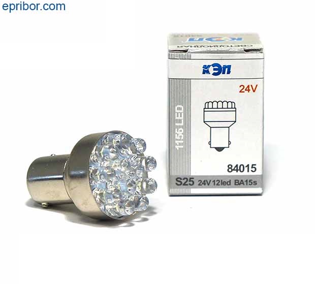 Автолампа светодиодная 24V S25 BA15s 12led. Используется для указателей поворота, фонарей заднего хода, стоп-сигналов, задних противотуманных и боковых габаритных фонарей, для освещения салона и индивидуального освещеня.