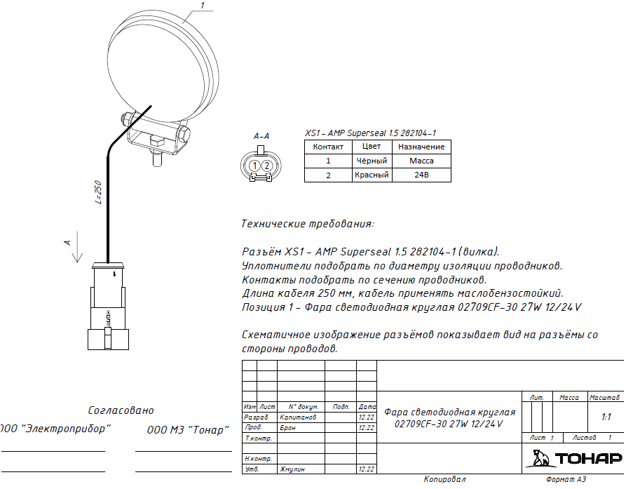 Фара светодиодная ФС 02709CF-31 круглая, рассеяный свет, в тонком корпусе с герметичным АМР разьёмом 282104-01.