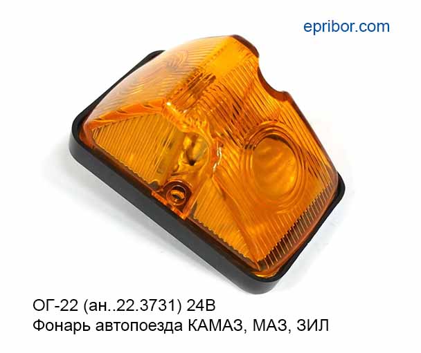Фонарь автопоезда ОГ-22 жёлтый, в фонаре используется автолампа А12-5 или А12-10 с цоколем BA15s, соединение с электрической сетью автомобиля происходит с помощью контактов штырьевых серии 6,3, также используется в качестве контурных огней.
