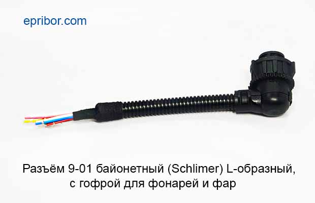 Разъём байонетный Schlemer (Жгут 9-01) L-образный в сборе, с гофрой для фонарей и фар головного света для иномарок и отечественных автомобилей КАМАЗ (фары 31., 311.3775, фонари серии 7472.3716-08,-04, 7462.3716-08,-04), МАЗ (фары 30.,301.3775), полуприцепы и прицепы (фонари ФЗ 05), Газель.