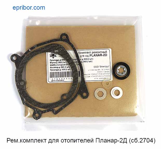 Рем комплект для отопителя Планар 2Д всех модификаций содержит: прокладки д. 2655, д 2656, д. 1070, втулка д. 2822, шайба д. 2660, изолятор д. 2661.